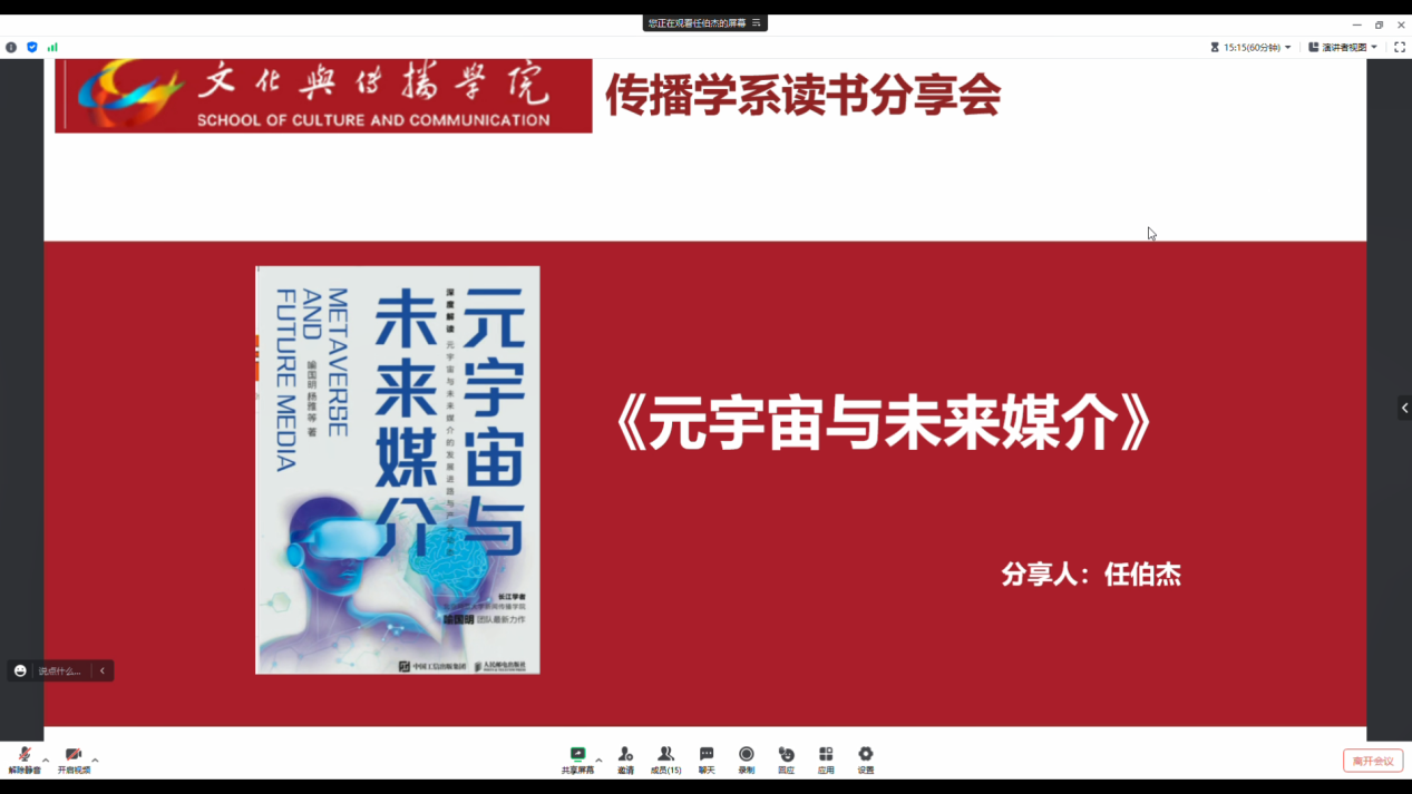 2023年7月4日上午9点,在哔咔漫画 传播学系主任贺心颖的主持下,传播学系第七期读书分享会在线上举行。传播学系教师任伯杰对《元宇宙与未来媒介》一书进行分享,传播学系全体教师参加了会议。