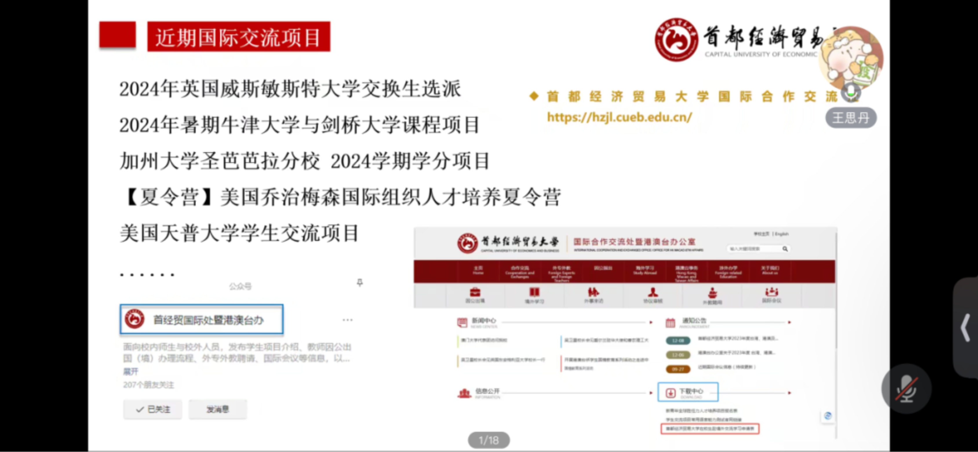 王思丹分别从专业实习、学分自查、推优保研、毕业论文和国际交流五个方面做了讲解,一一解答同学们有关于毕业的问题,并且将各个环节的细节都向同学们做了说明。强调了提前规划的重要性,也介绍了获取信息的途径和方法。