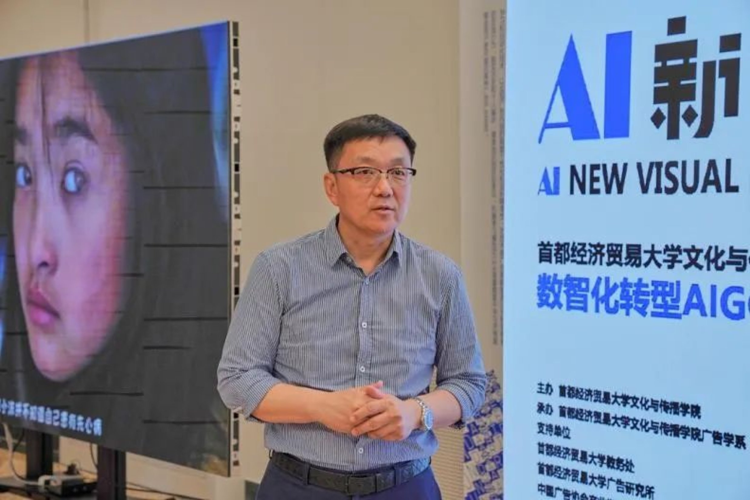 王水对教学成果展进行讲解。他介绍作为学校首批十个数智化转型专业之一的广告学,在课程数智化改革方面取得的丰硕成果。他从行业背景、创意作品和广告“智变”三个方面进行了比较详细的介绍,并展示了广告学教师和同学在数智化转型教学中参加论坛、投放广告以及制作公益宣传影片等教学成果。